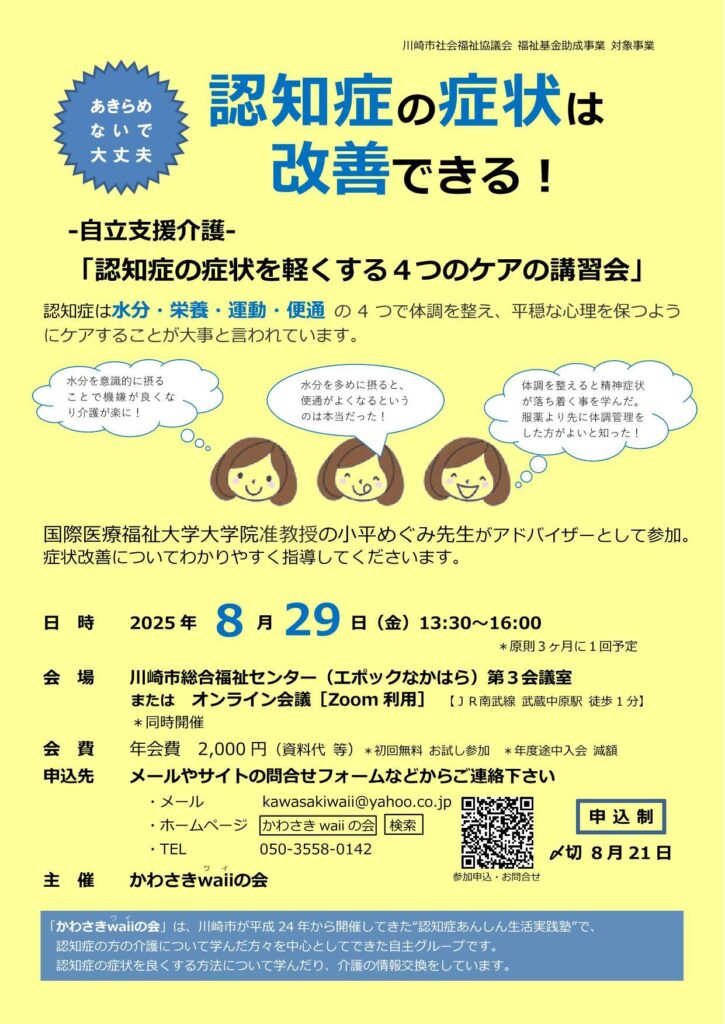 同時開催 Zoom・会場 第36回 認知症の症状を軽くする4つのケアの講習会(8/29) 投稿日: 2025年8月9日 2025年8月17日 投稿者: kawasakiwaii カテゴリー: お知らせ 投稿ナビゲーション 前 過去の投稿: 同時開催 Zoom・会場 第35回 認知症の症状を軽くする4つのケアの講習会(5/15) kawasakiwaii 25RSS
